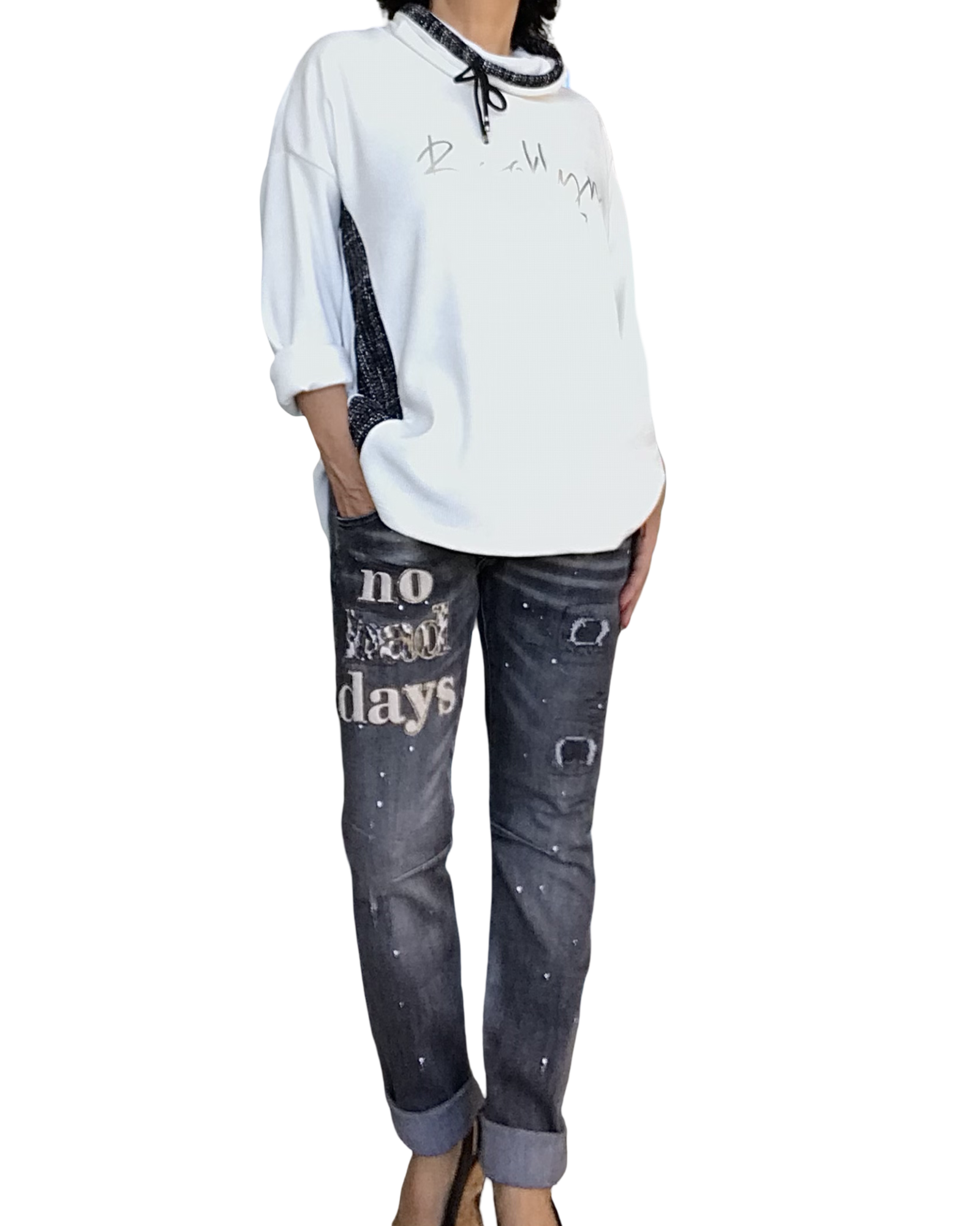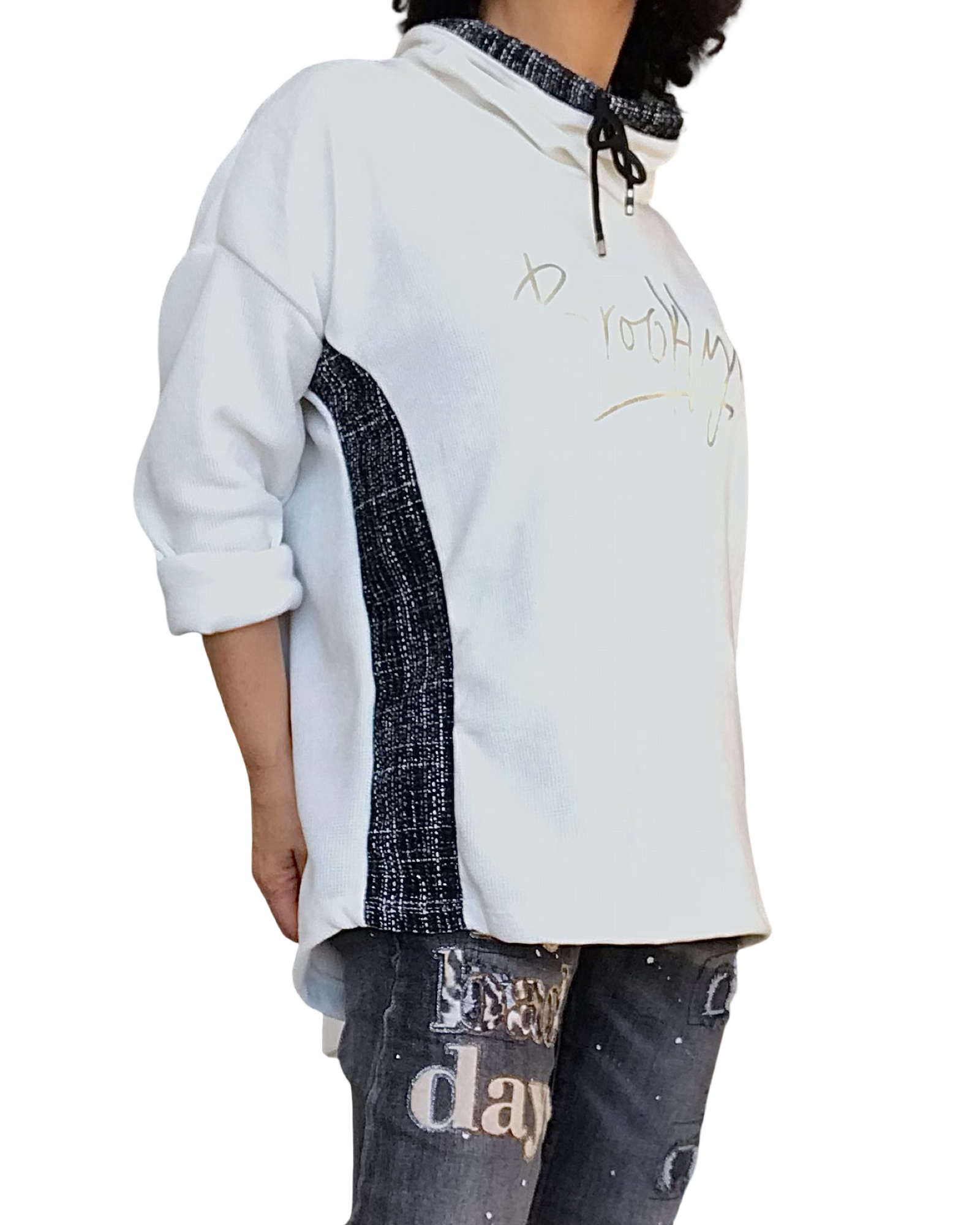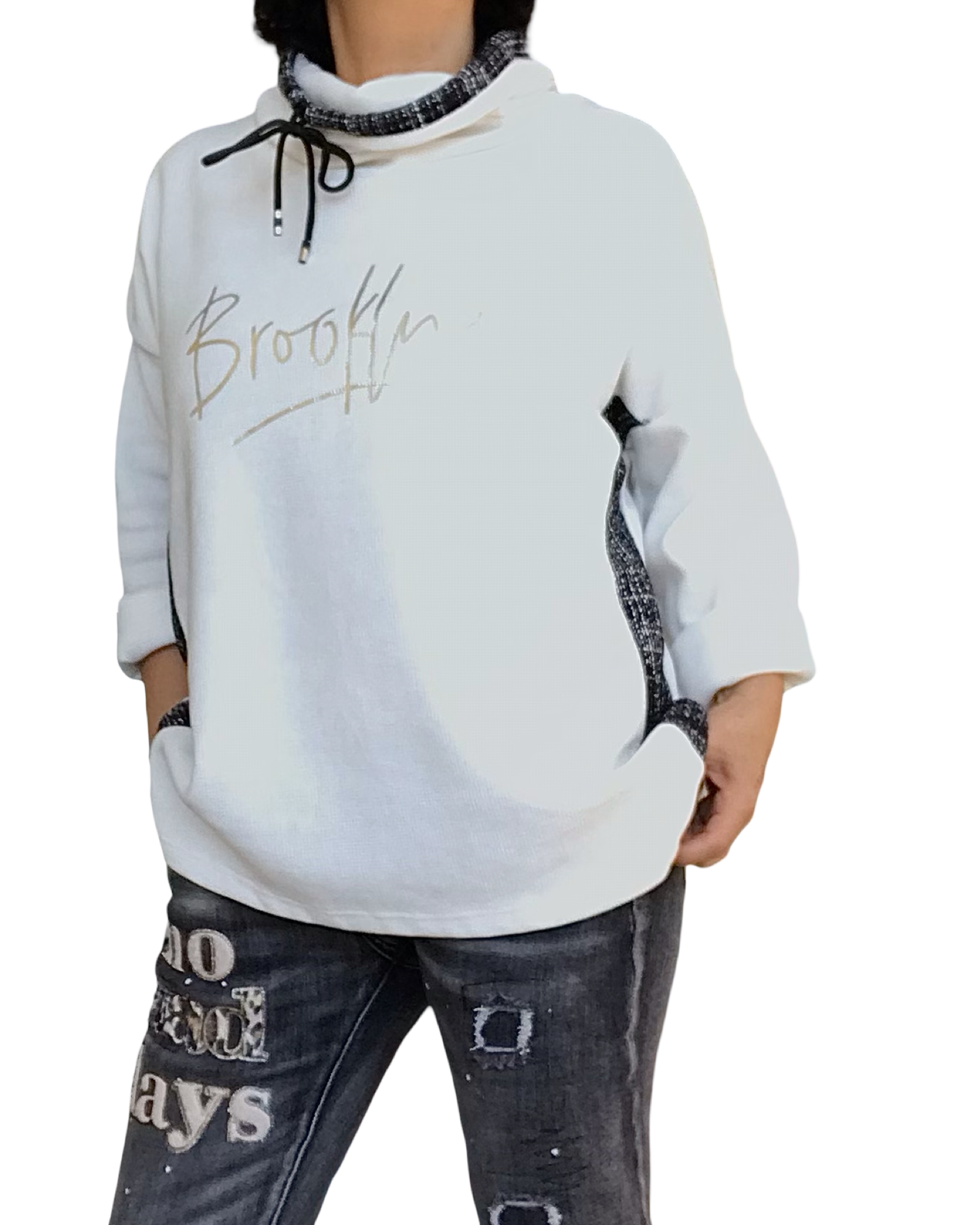 Découvrez le chandail col cheminé en velours crème ✨, une pièce raffinée et cosy ! Col garni de tweed noir et gris avec cordon noir, rubans tweed sur les côtés 🖤. Écriture argentée devant, plus long derrière que devant. Ultra-doux et confortable pour l'automne ! 🍂