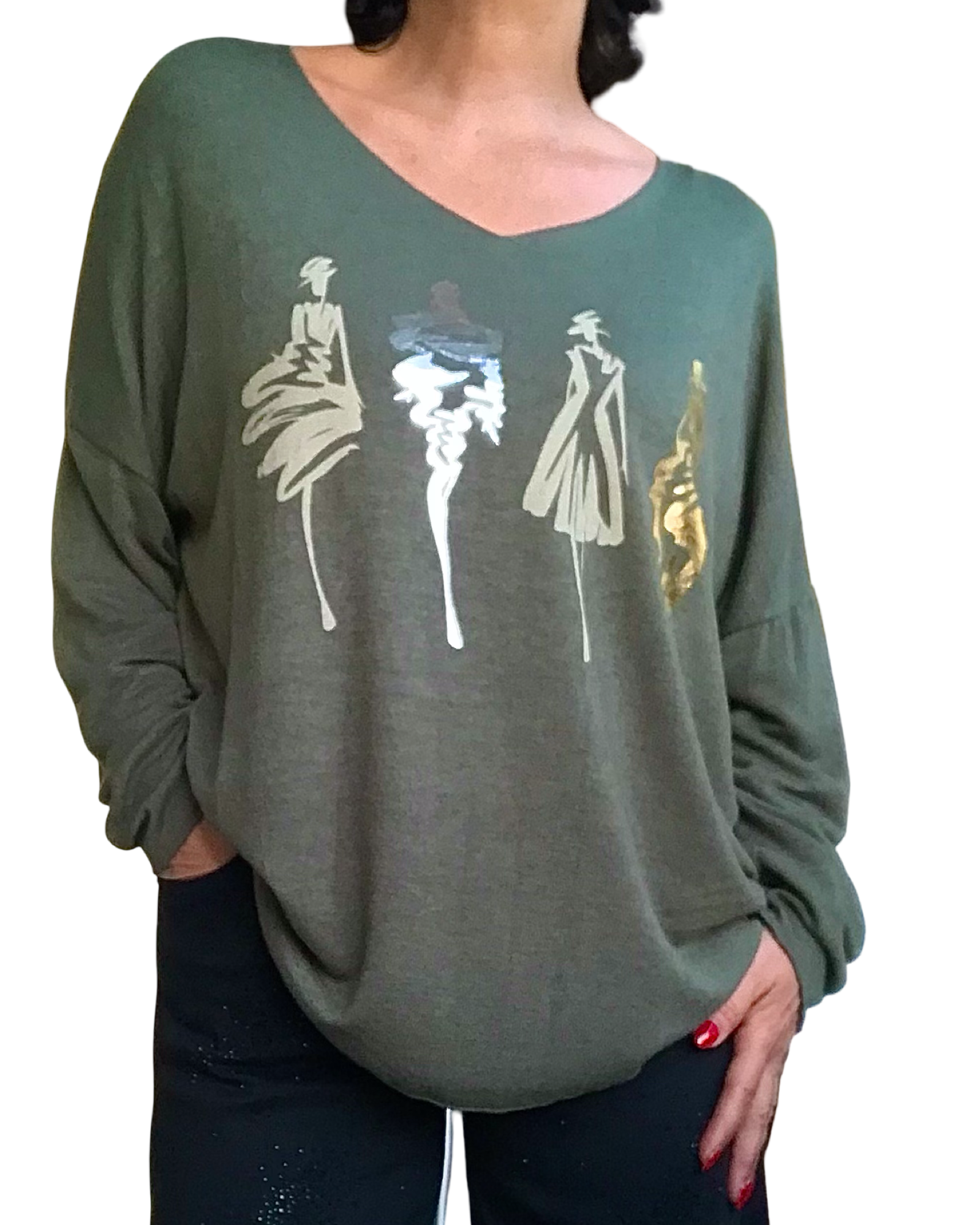 Chandail uni kaki col en V avec esquisse de 4 femmes devant