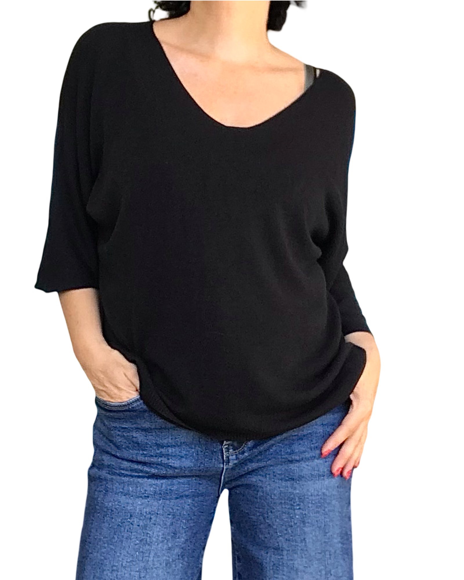 Ce chandail marine uni séduit par sa douceur et sa légèreté. 💙 Son tricot fin en modal et acrylique le rend parfait pour toutes les saisons, seul ou superposé à vos pièces favorites. 🌸