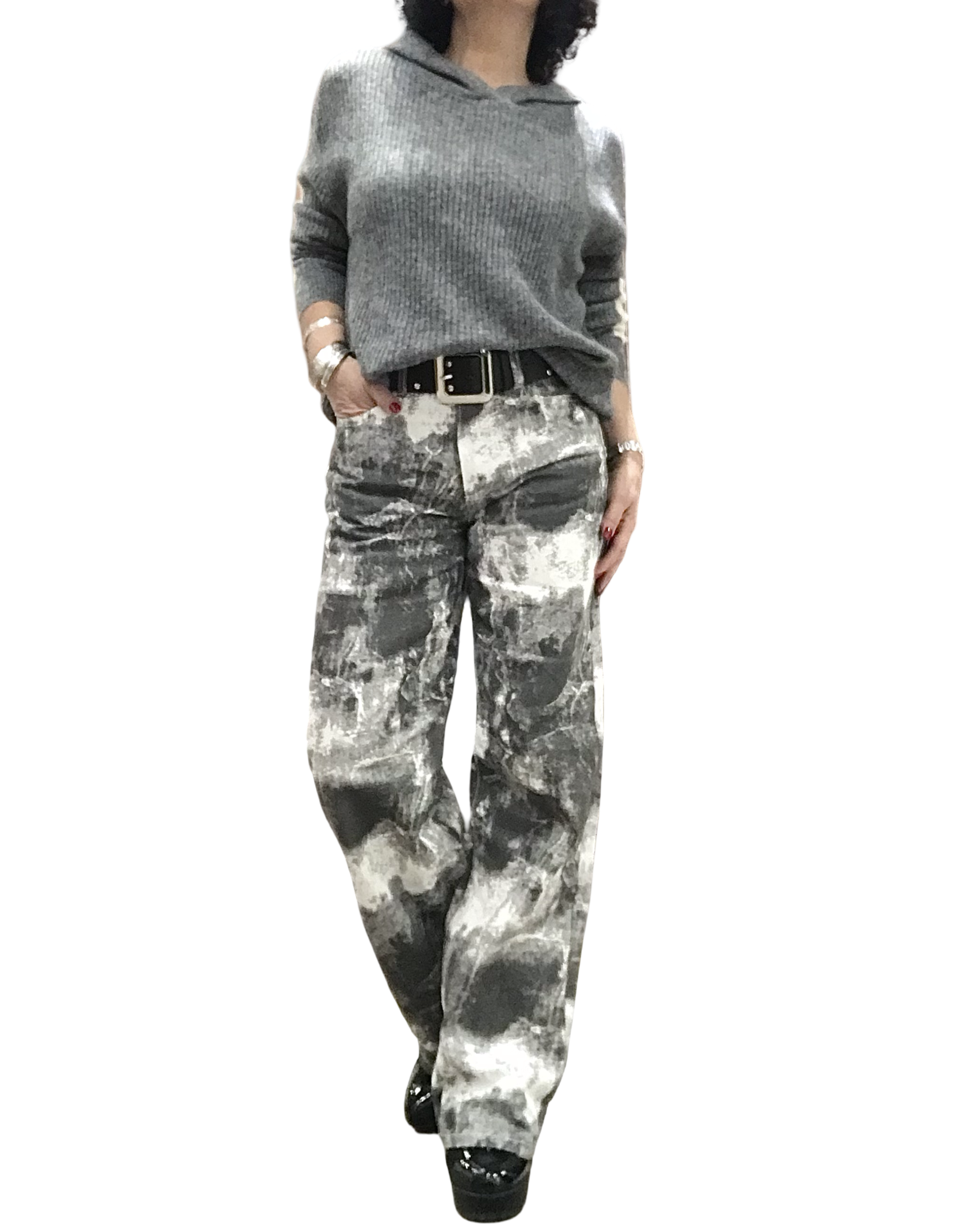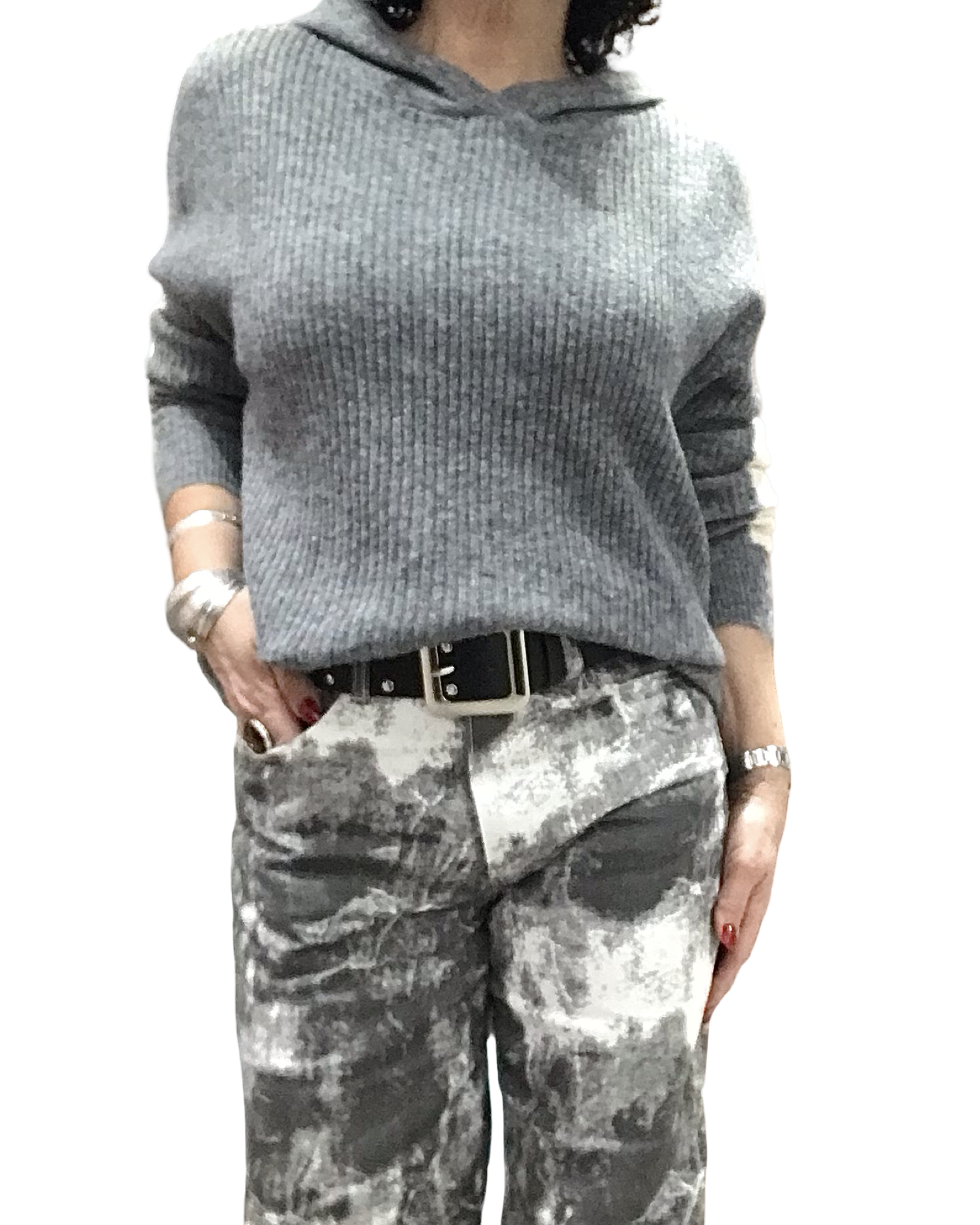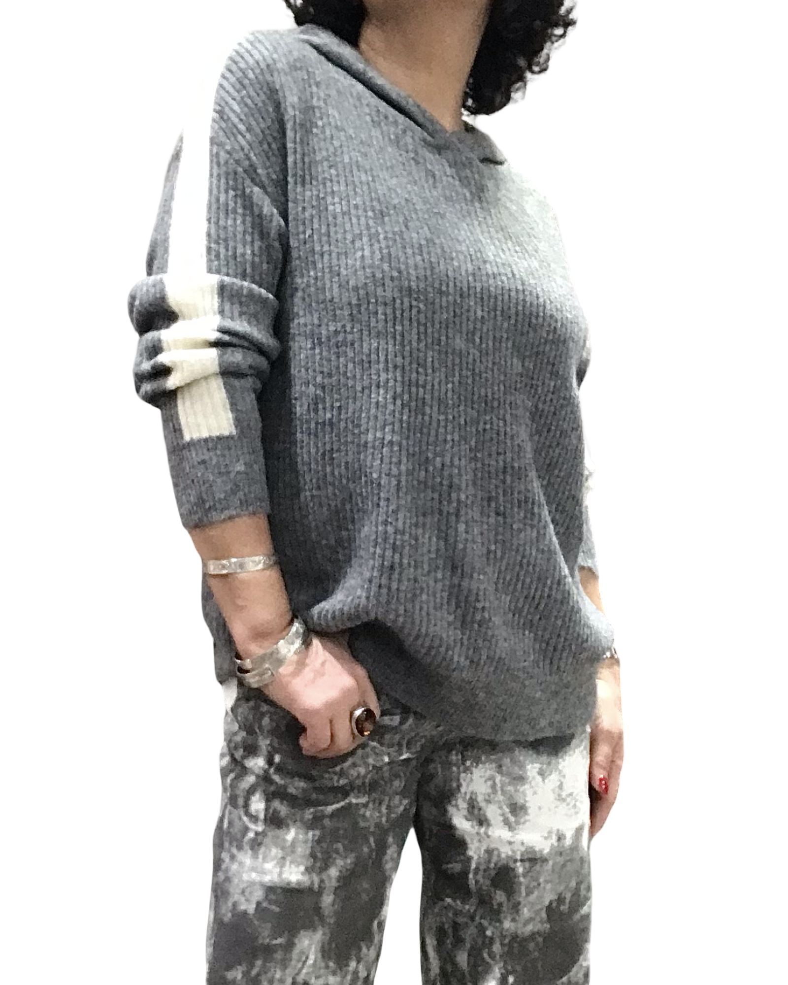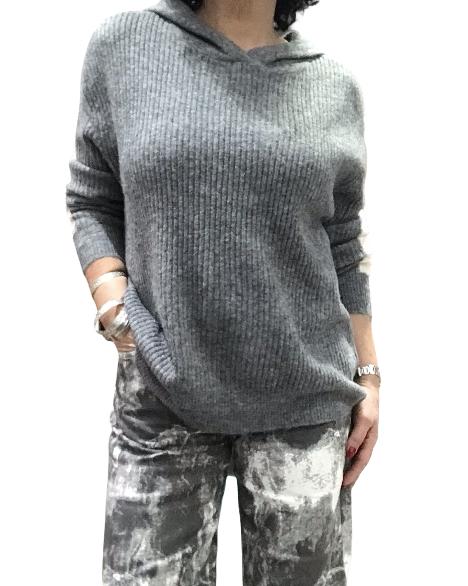 Chandail gris en tricot rib, doux et laineux 🤍. Capuchon pratique, manches longues ornées d’une bande crème élégante. Confort absolu, il ne pique pas et offre une allure moderne.