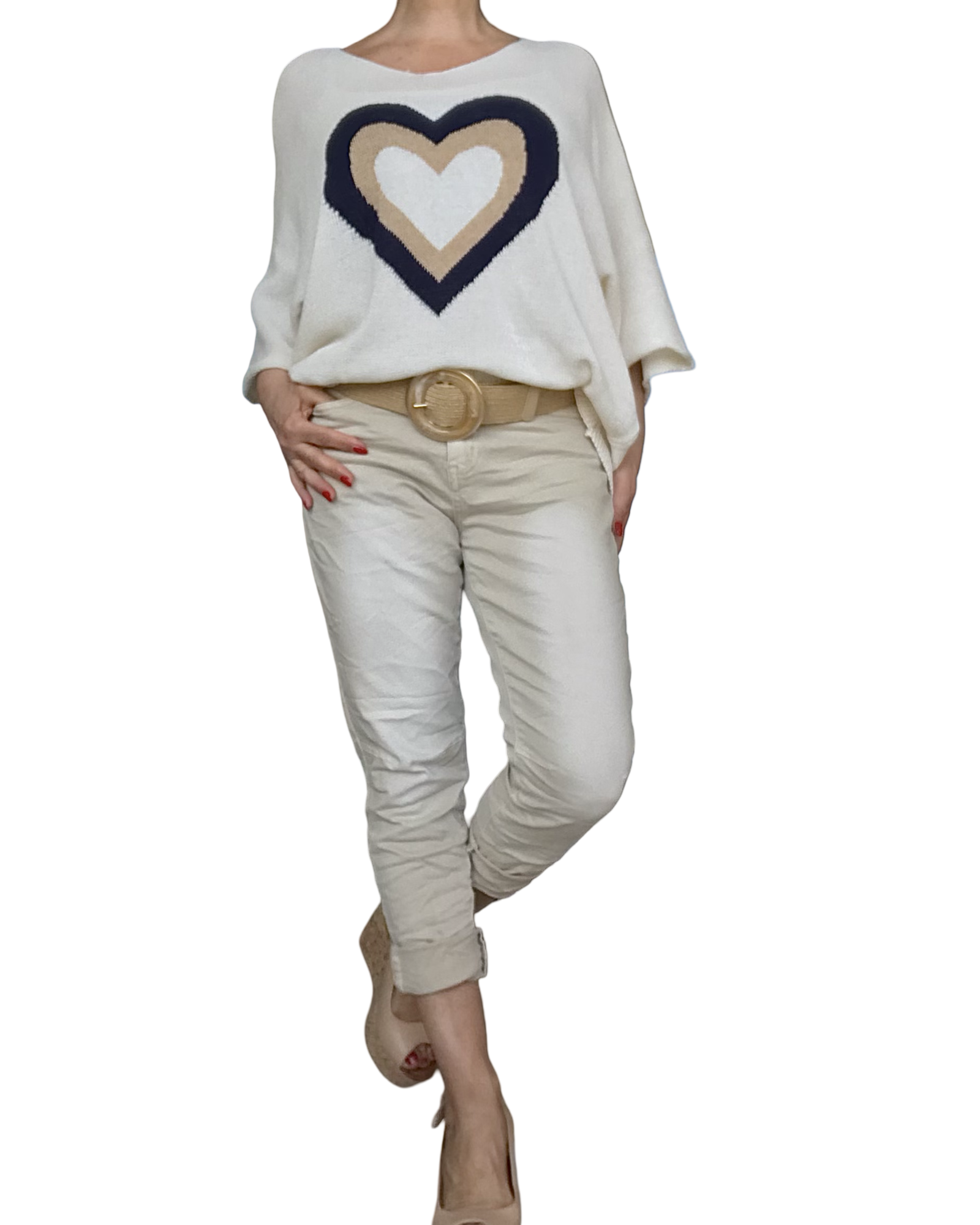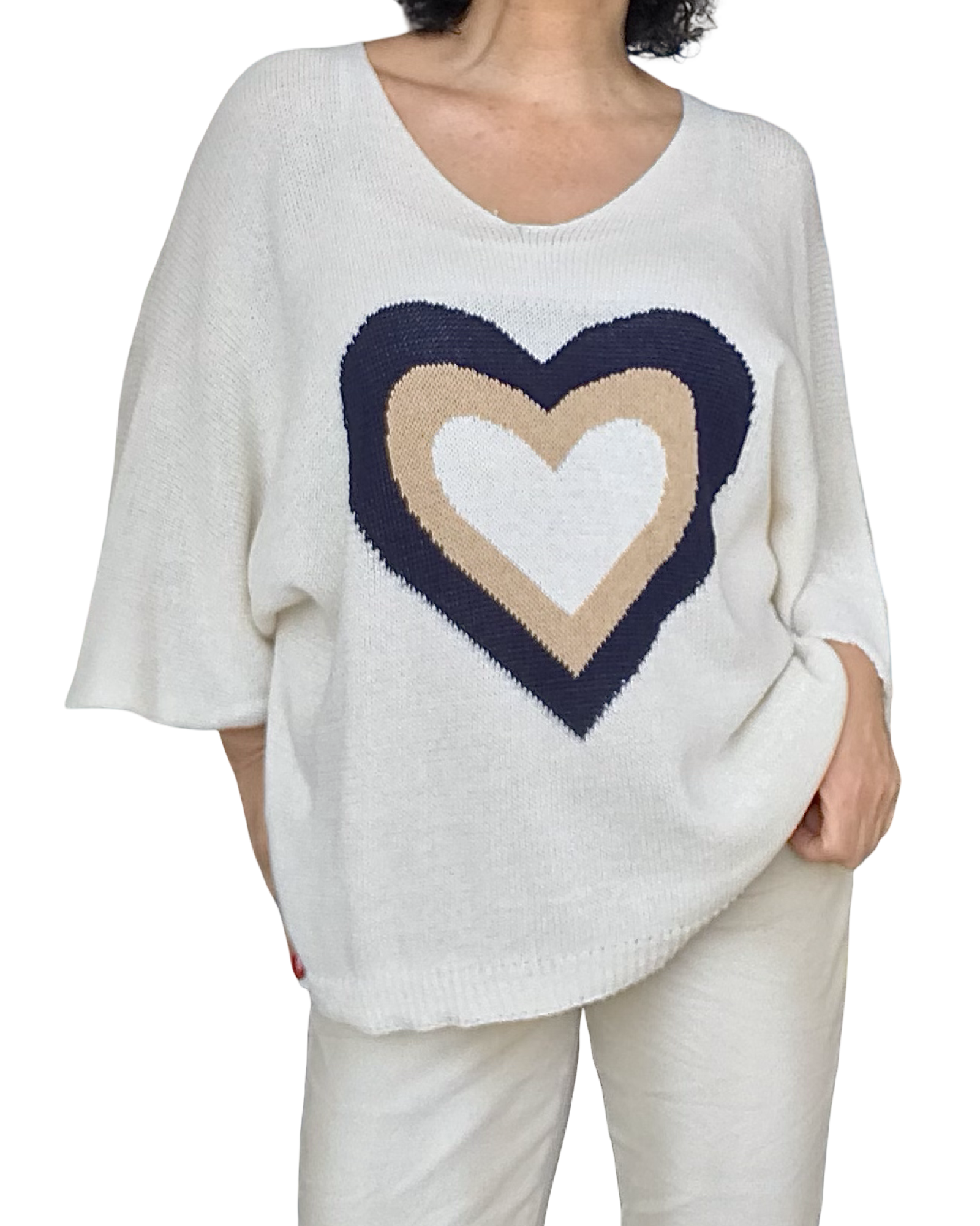 Chandail Vanille Cœur Tricolore Col V Manches Chauve-Souris – Description du produit