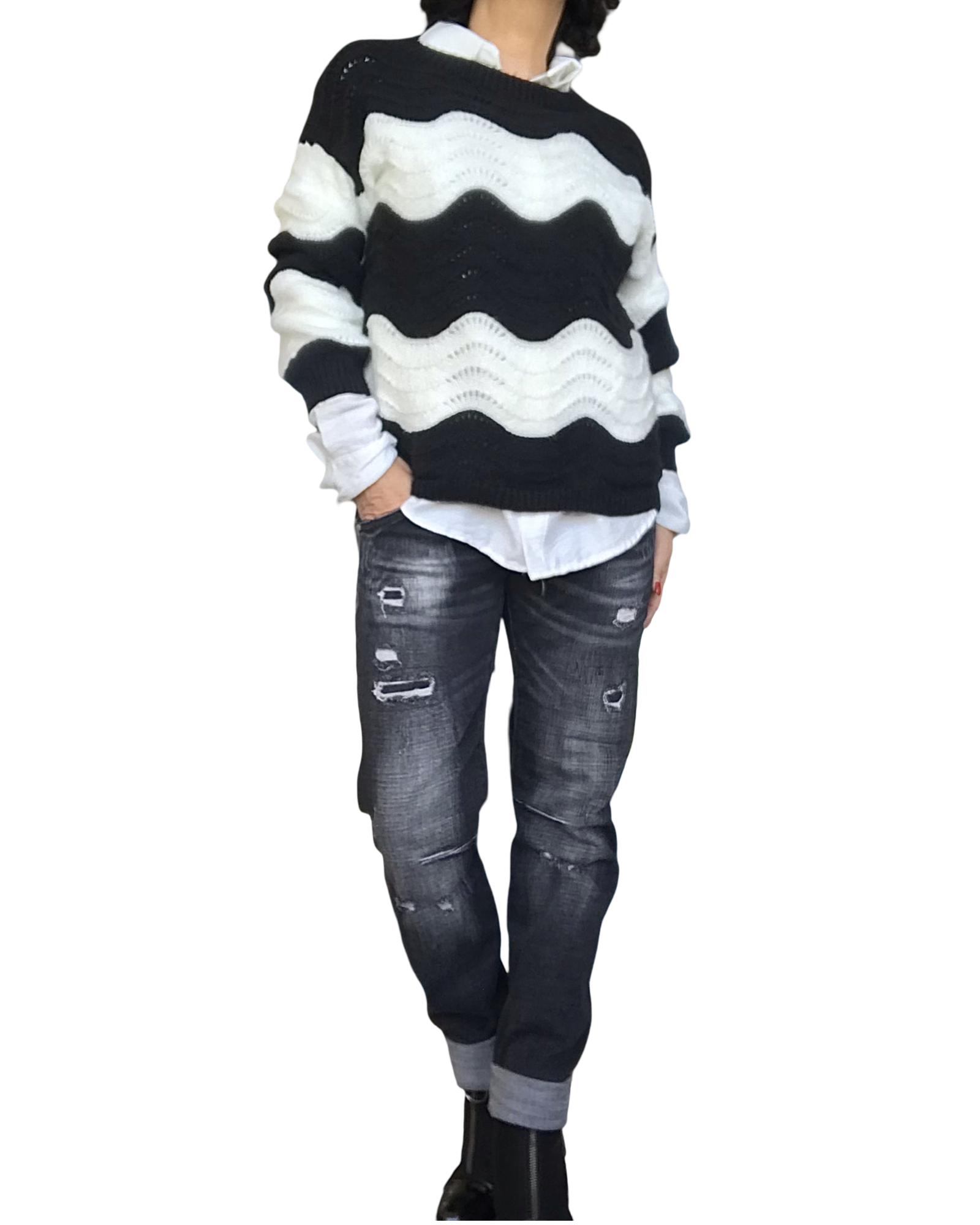 Craquez pour le jeans boyfriend noir délavé déconstruit 🖤, l'esprit décontracté avec du caractère ! Trous avec patches et égratignures sur les deux jambes apportent une touche rock ✨. Coupe boyfriend confortable et extensible. Original et très actuel au quotidien ! 💫