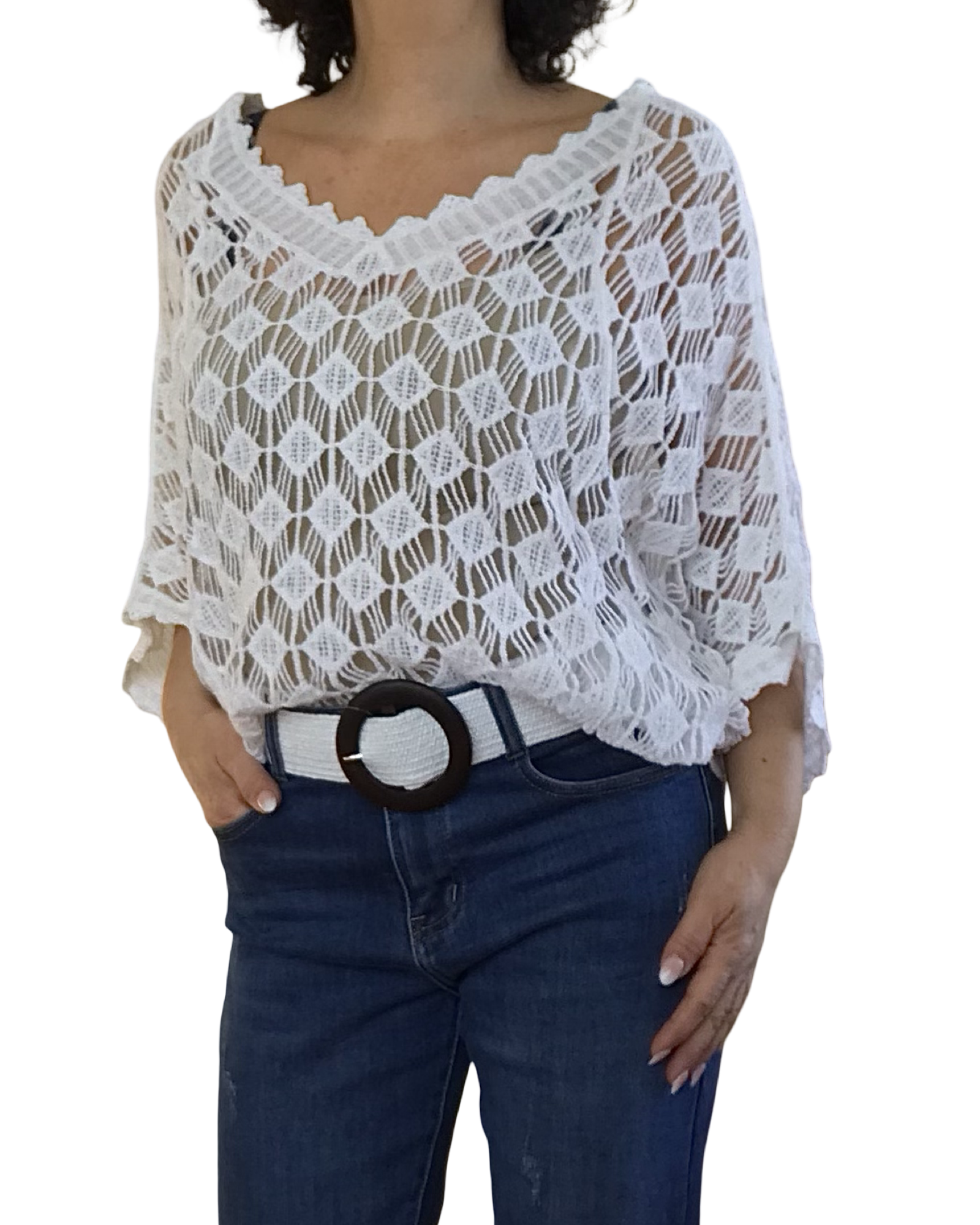 Adoptez ce chandail blanc en crochet losange col V dentelé devant et derrière 🤍 Manches courtes chauve-souris élégantes. Léger et confortable :