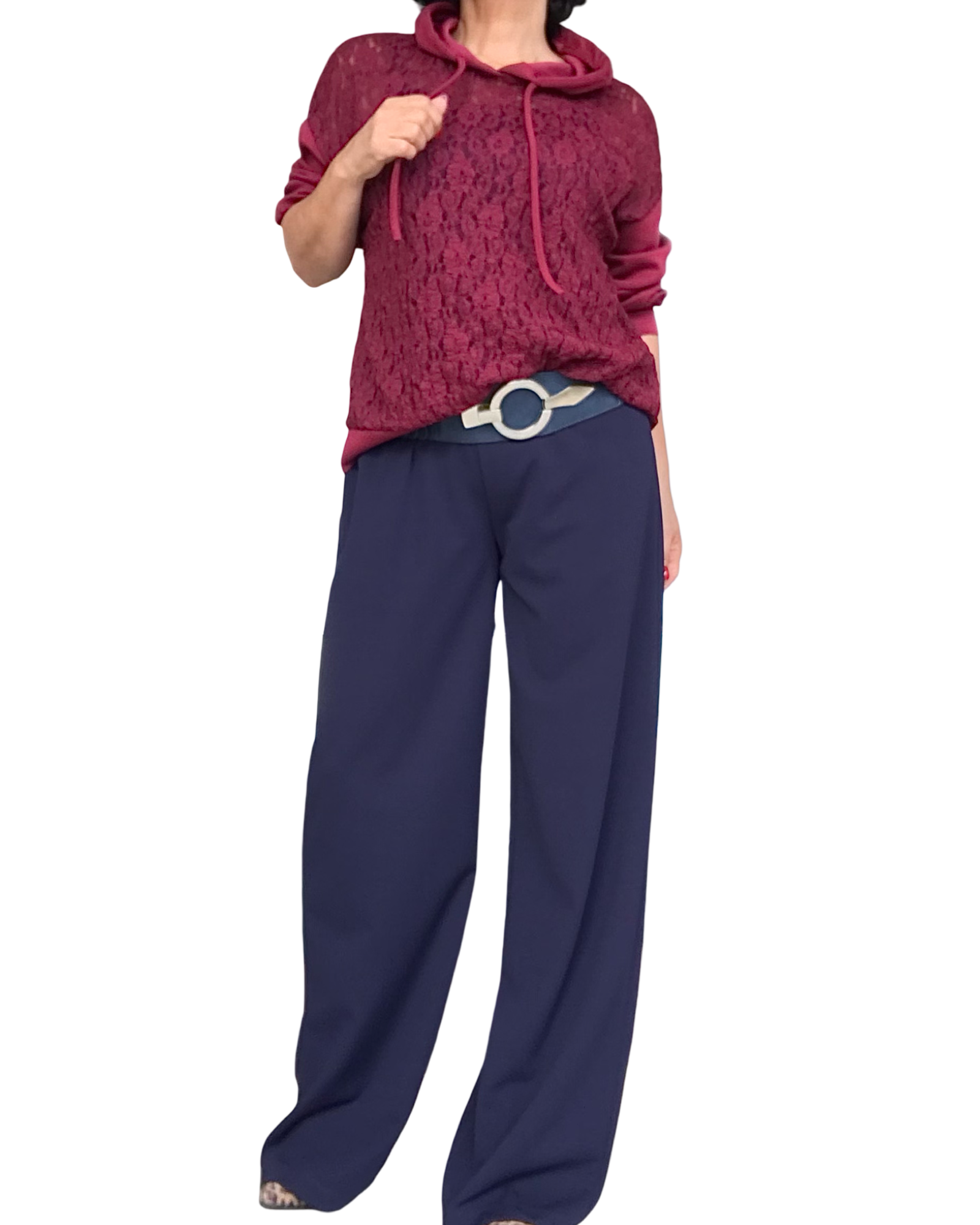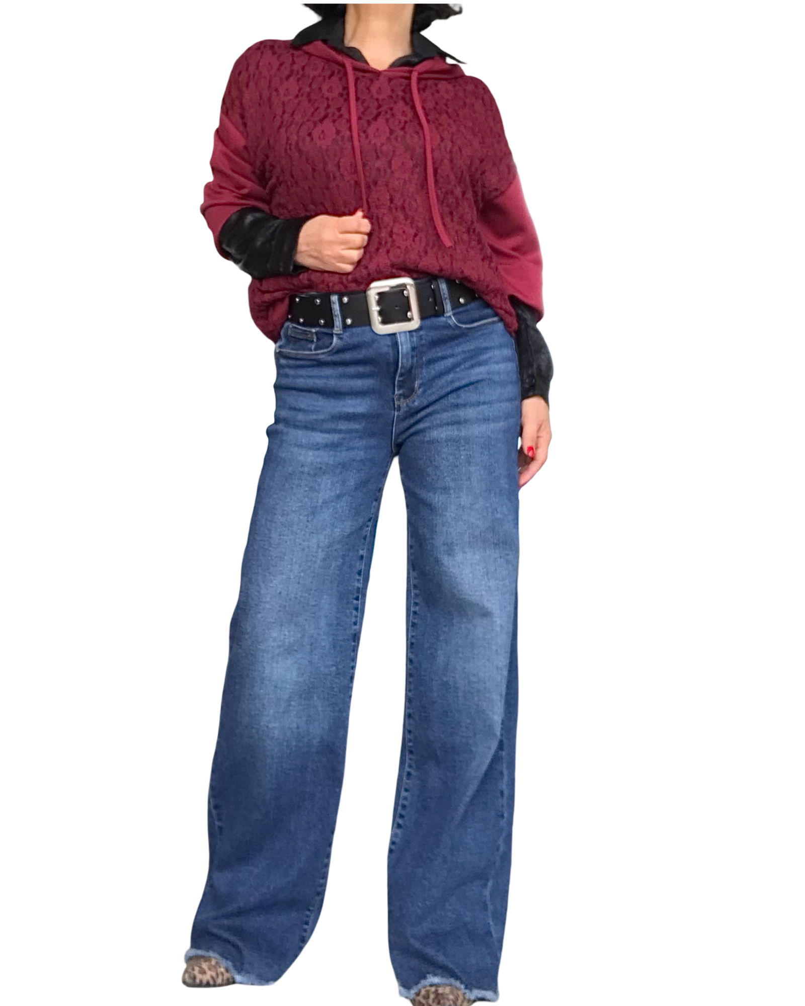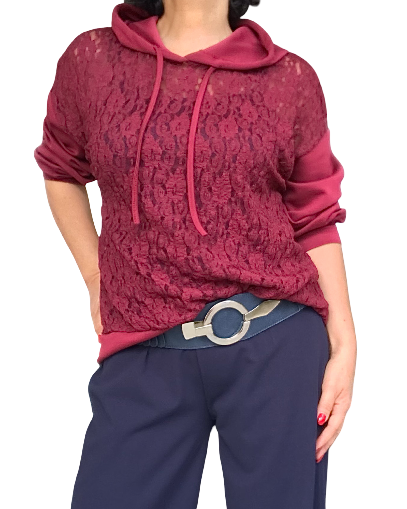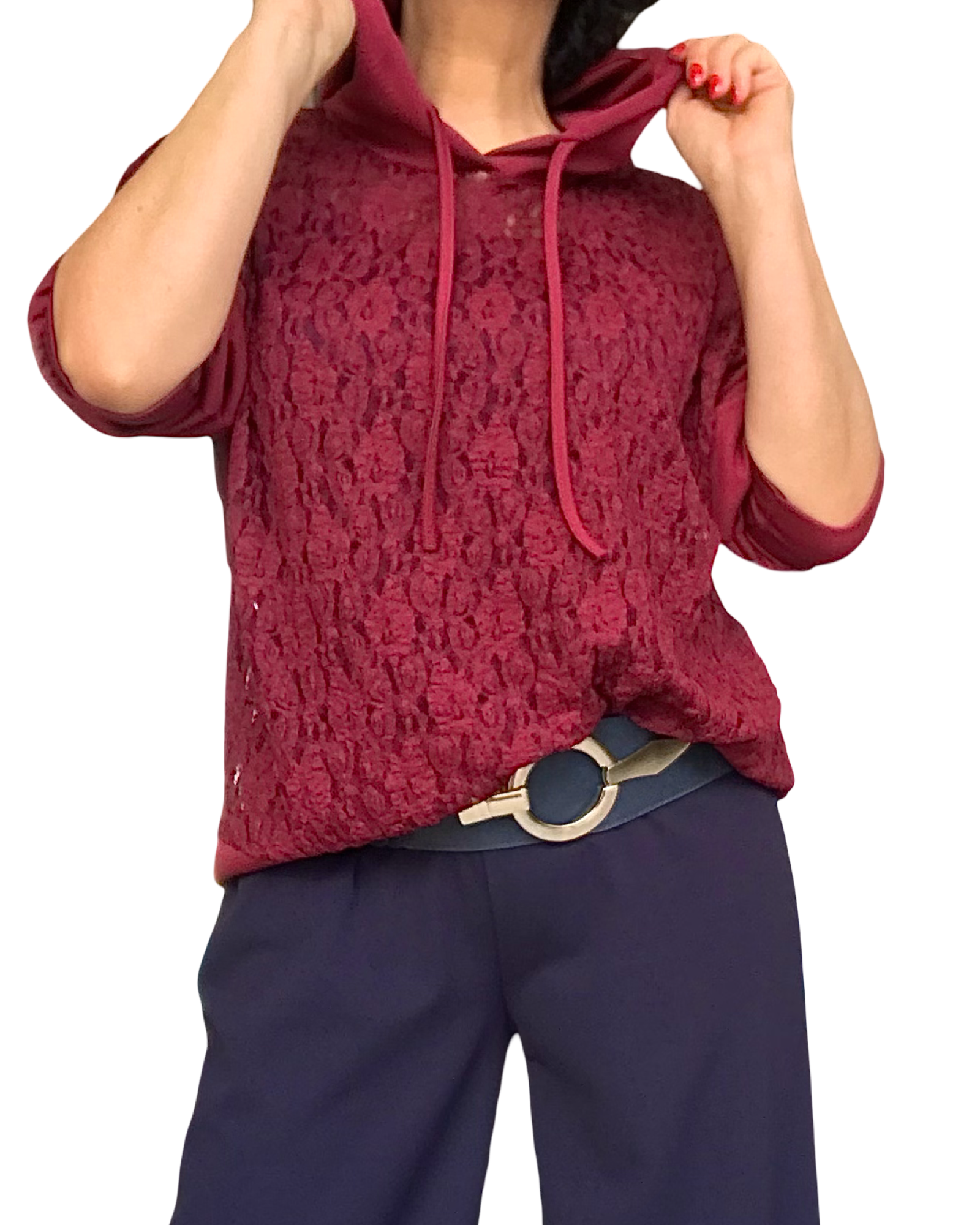 Chandail rouge vin en dentelle avec capuchon – Description du produit