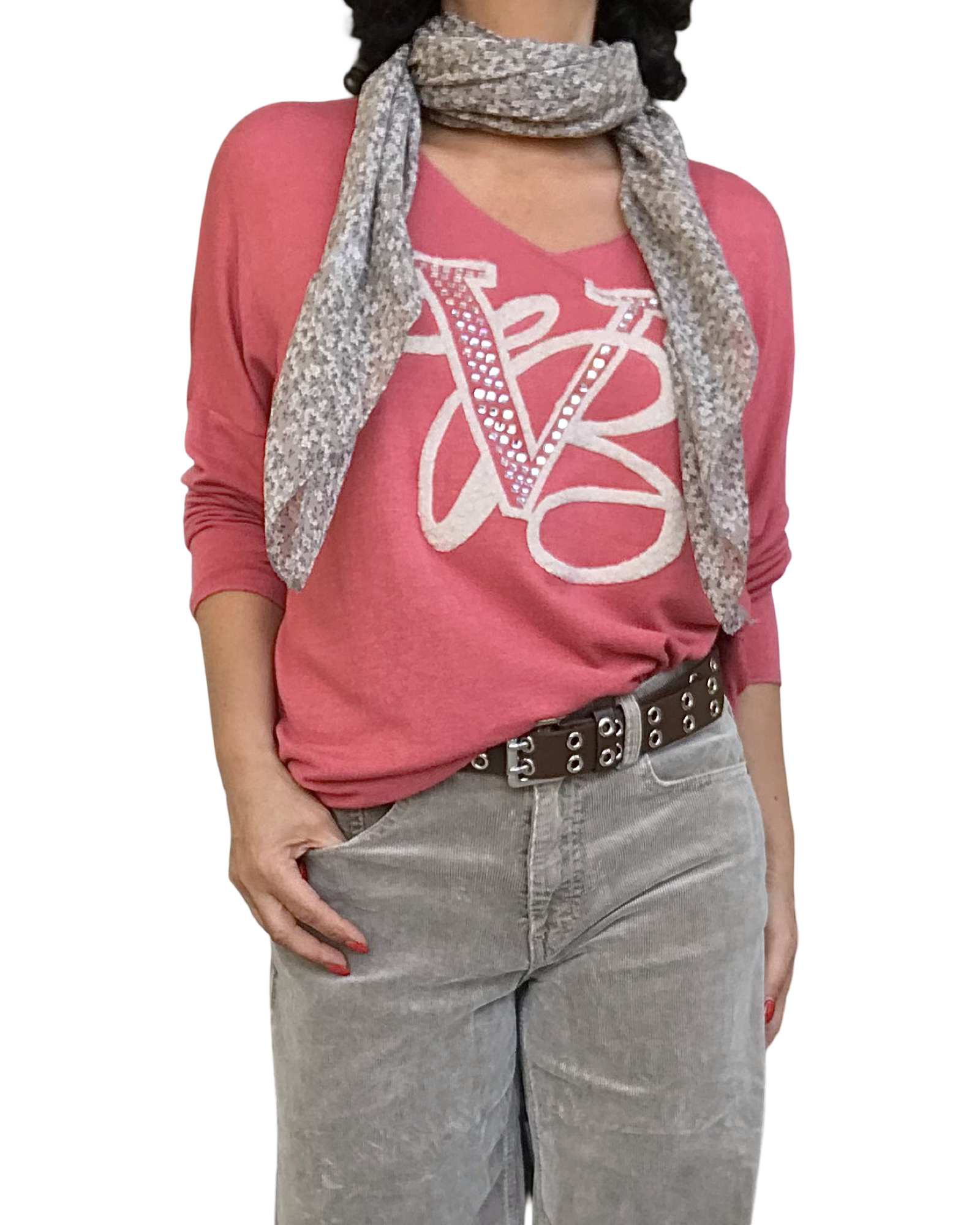 Chandail uni corail col en V avec un appliqué de deux lettres devant
