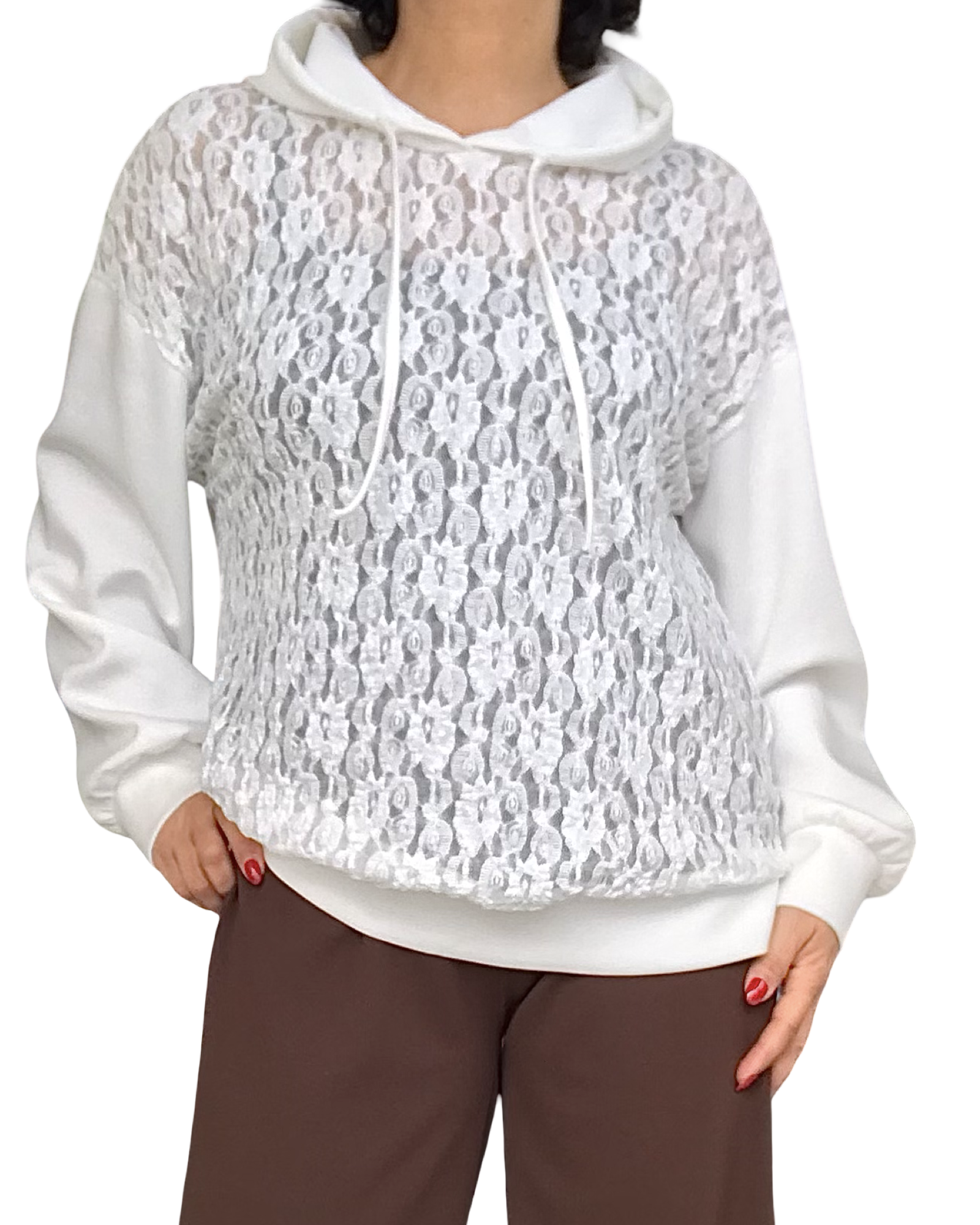 Chandail blanc en dentelle avec capuchon – Description du produit