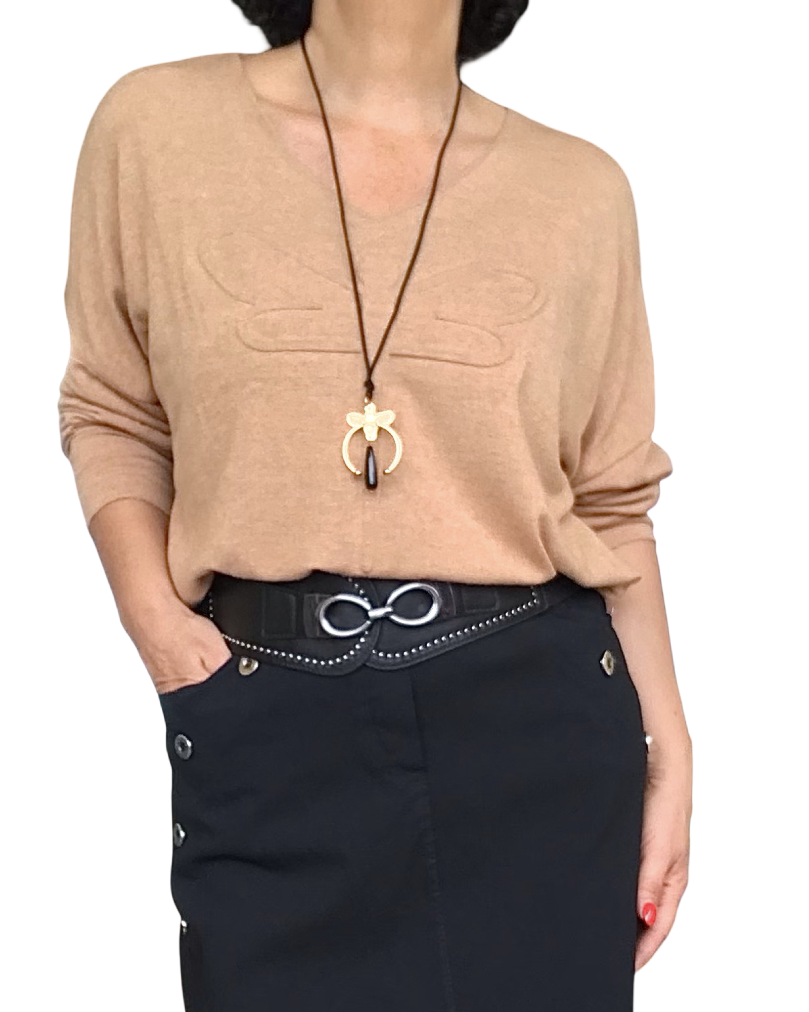 Chandail uni camel col en V libellule embossée : Caractéristiques techniques