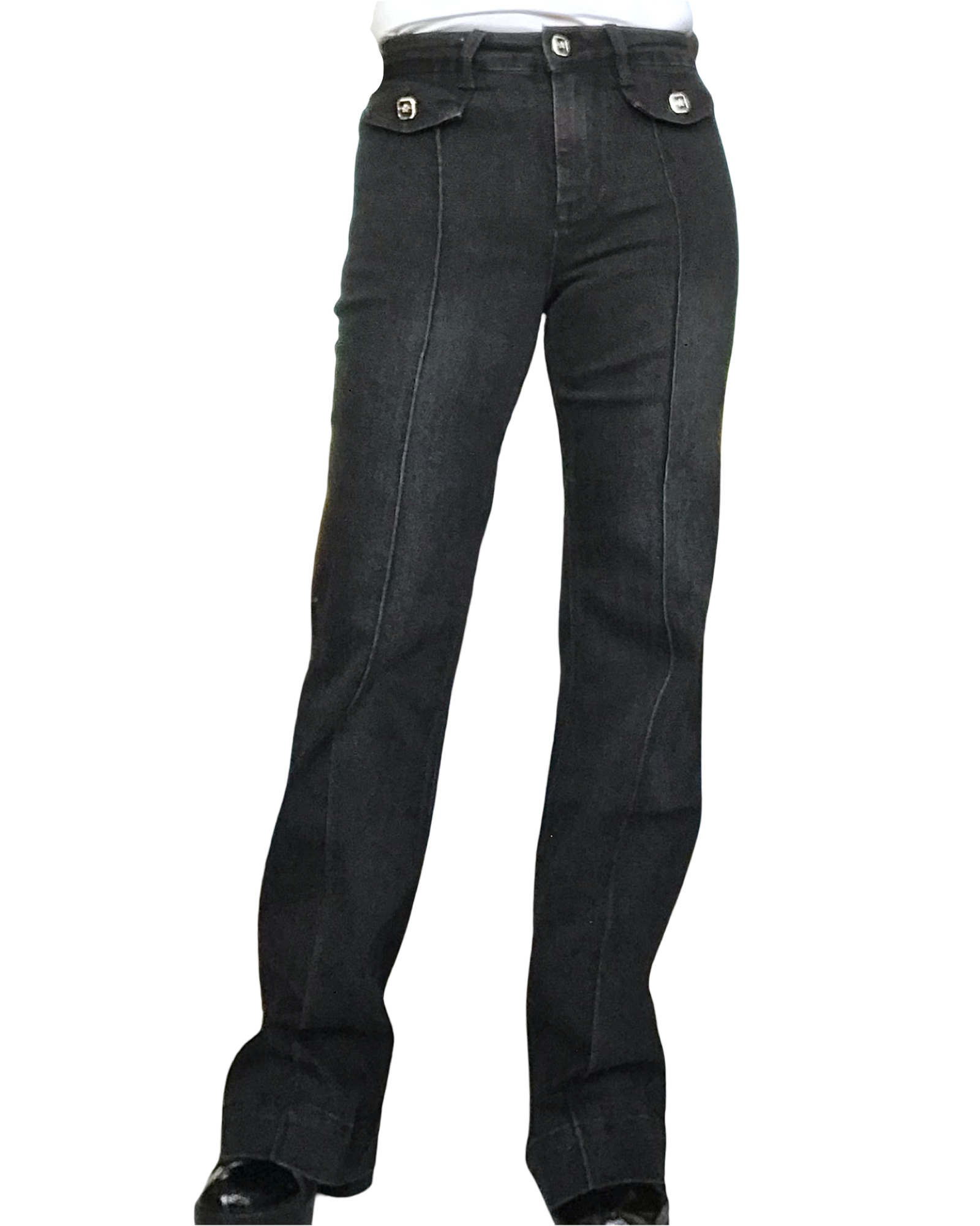Découvrez le jeans noir jambe droite avec surpiqûres 🖤, sophistiqué et confortable ! Surpiqûres le long de la jambe et rabats à boutons décoratifs ✨. 31 pouces, taille haute au nombril, extensible. Sans poches avant pour une ligne épurée. Élégant et polyvalent ! 💫