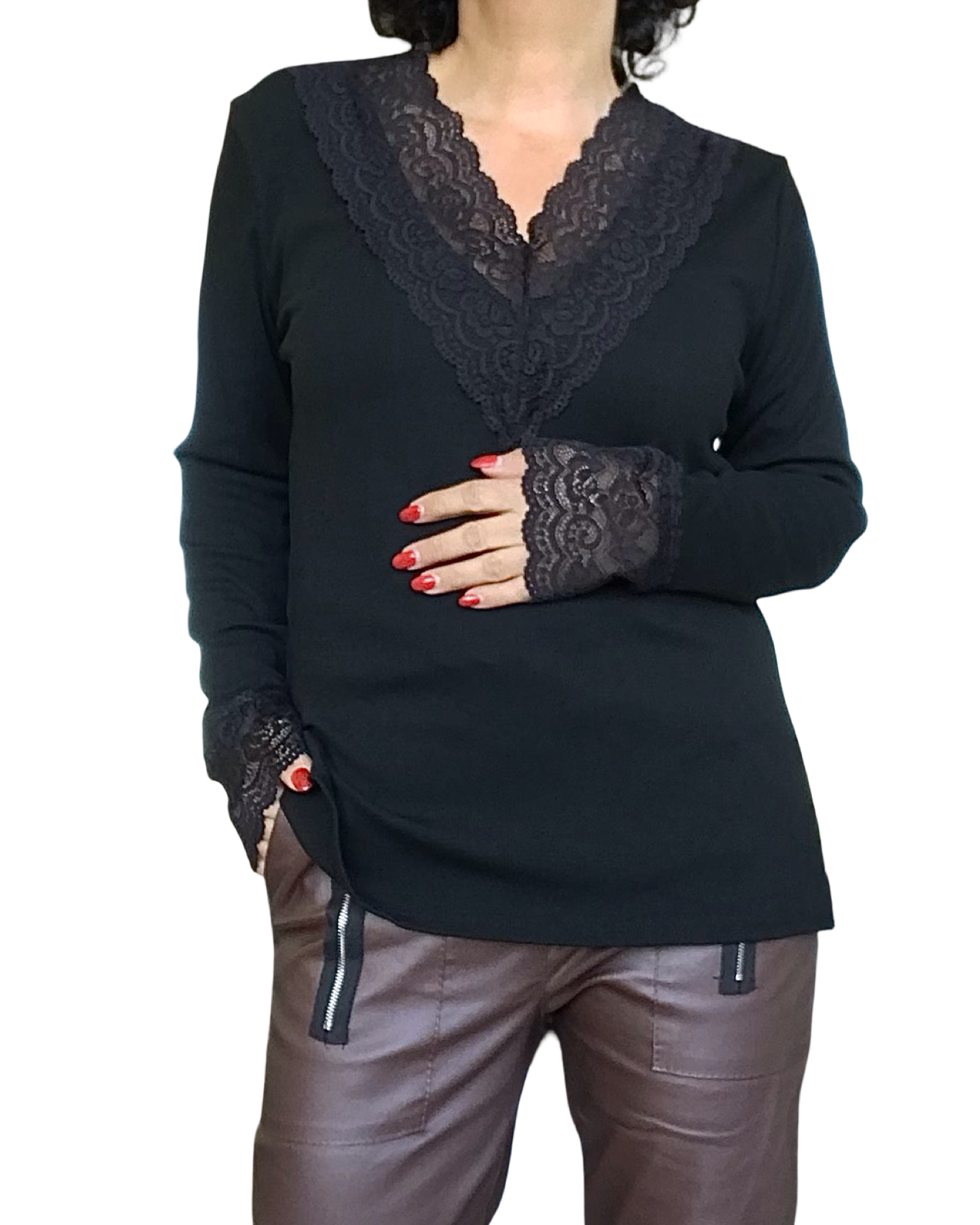 T-shirt noir uni, manche longue, col en V en dentelle et bas des manches en dentelle